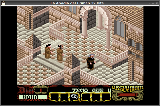 No estoy seguro si el primer port de La Abadía fue en 1997 o en 2001. En cualquier caso, parece que Antonio Giner migró el juego a MSDOS y posteriormente a 32 bits. Las mejoras, unos agradecidísimos 256 colores (jeje) y la posibilidad nostálgica de jugar con los colores iniciales. Realmente una maravilla. Yo recuerdo haber jugado a esta versión agradeciendo de verdad los cambios.
